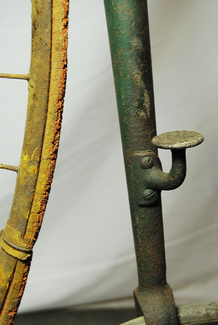 This model features original details like locknut spokes and open head. It still has plain bearings of the first model, making it an 1880-81 bicycle. Late 1881 Columbia switched to detachable plain bearings. Ball bearings were offered as an option in 1882. Being a cheap model, it still has a lot of late-1870 details. Look at the brass oilers on the front bearing!