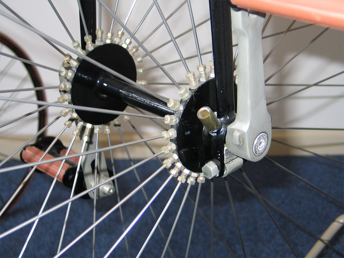 The first models (1879) didn't have detachable cranks. The later models (1883-1887) had direct spokes, without the oldfashioned locknuts. Although the small sizes, 46 and 48 inch, kept the locknut spokes until the end of production.